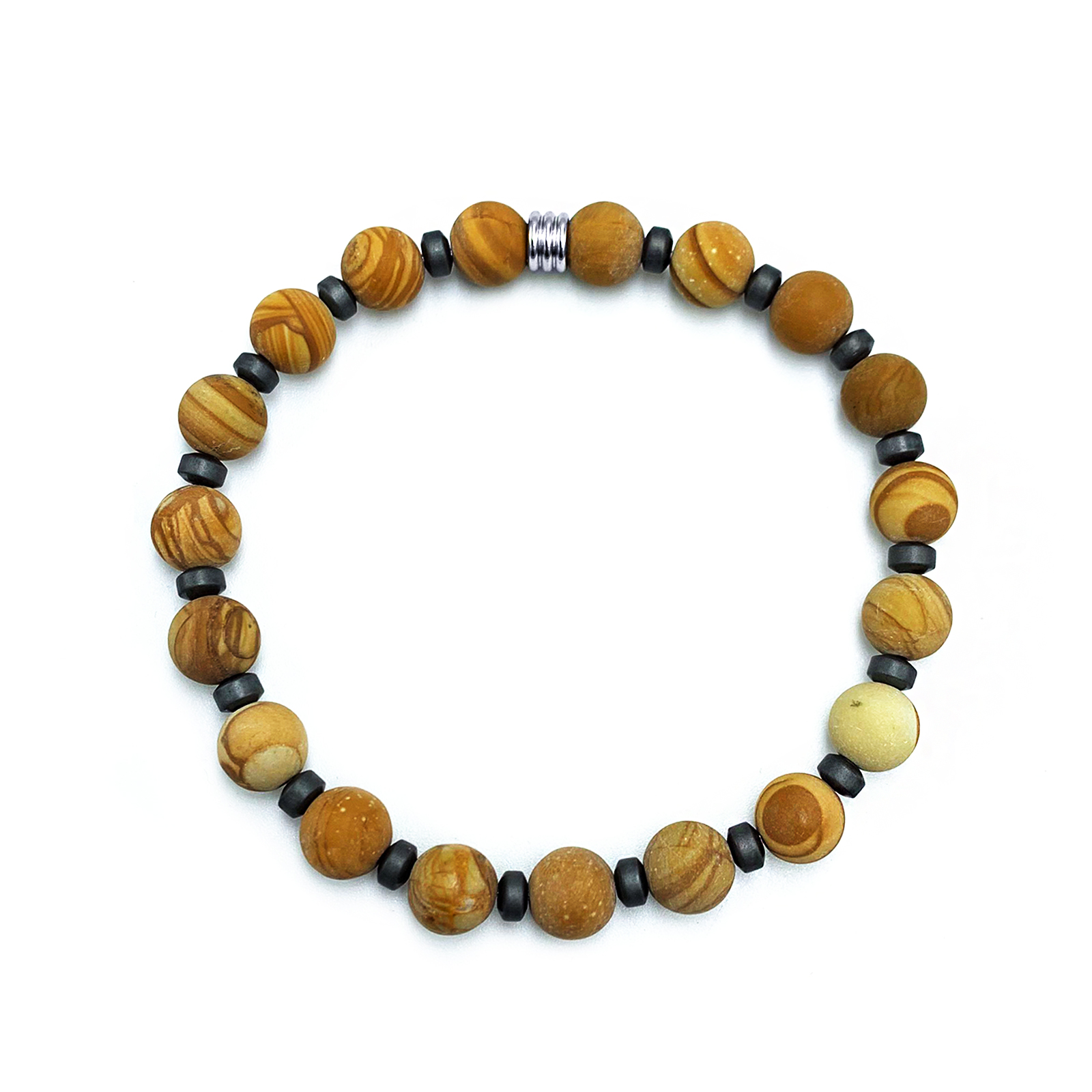 Οι ημιπολύτιμες πέτρες Jasper Wooden προσφέρουν γήινους τόνους και μια αίσθηση ηρεμίας, ενώ οι αιματίτες προσδίδουν μια εκλεπτυσμένη πινελιά και φημίζονται για τις ενεργειακές τους ιδιότητες. Το ελαστικό κορδόνι εξασφαλίζει άνετη και ευέλικτη εφαρμογή για κάθε μέγεθος καρπού.