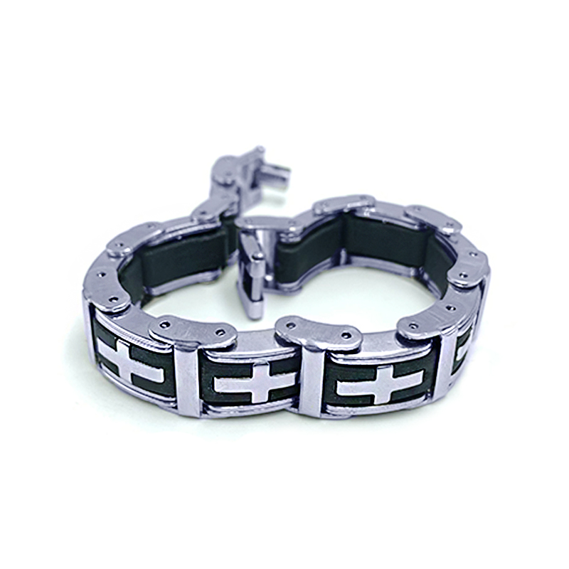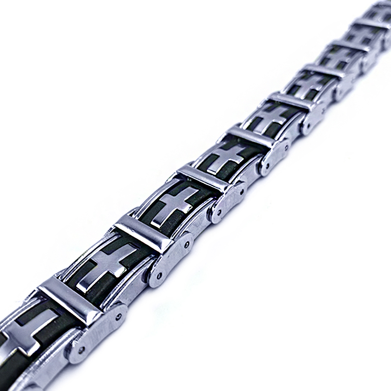 Το βραχιόλι αυτό είναι κατασκευασμένο από ανοξείδωτο ατσάλι και έχει μοντέρνο σχέδιο που κυριαρχείται από σταυρούς, ενσωματωμένους σε κάθε κρίκο. Το υλικό του είναι ανθεκτικό, υποαλλεργικό και σχεδιασμένο για μακροχρόνια χρήση χωρίς φθορά.