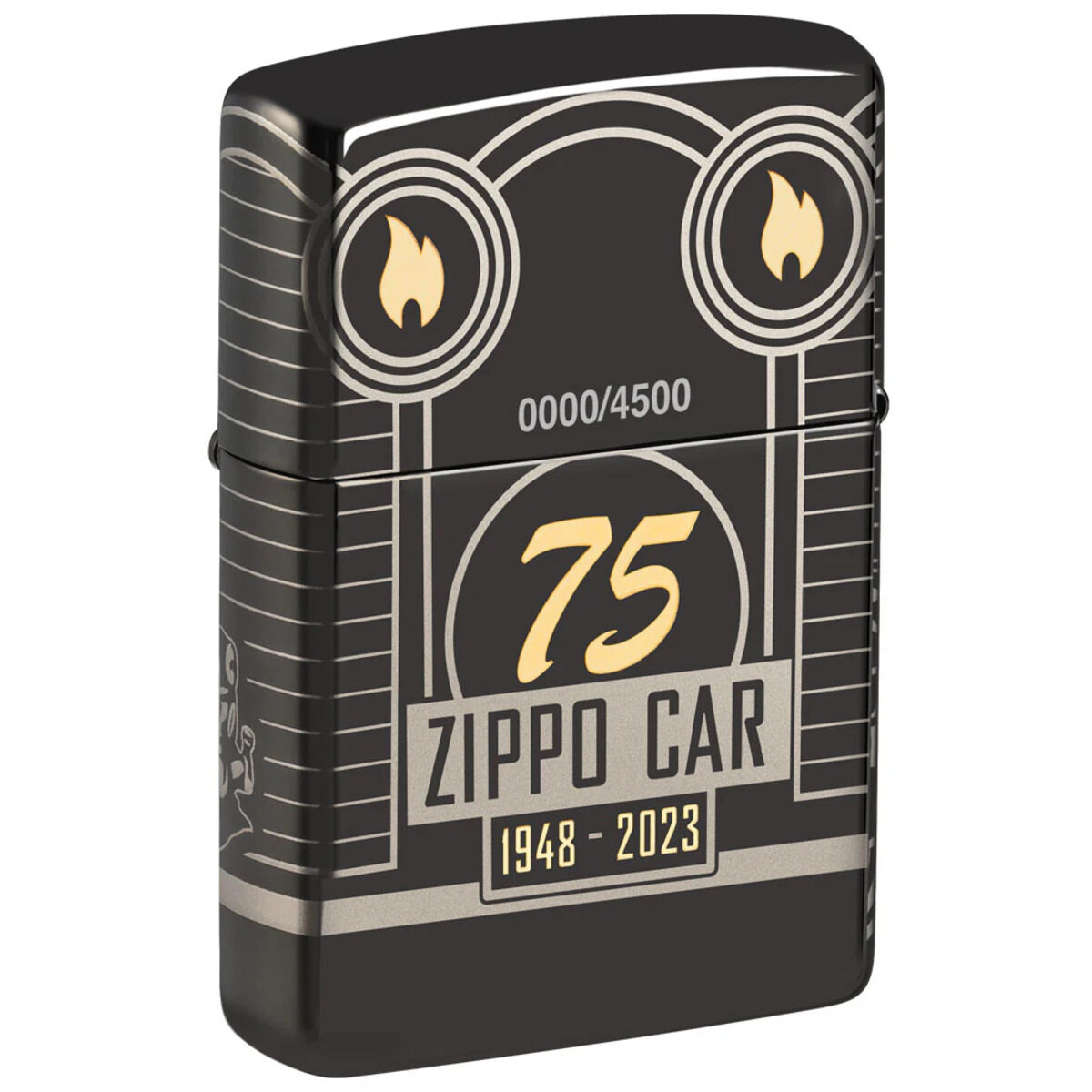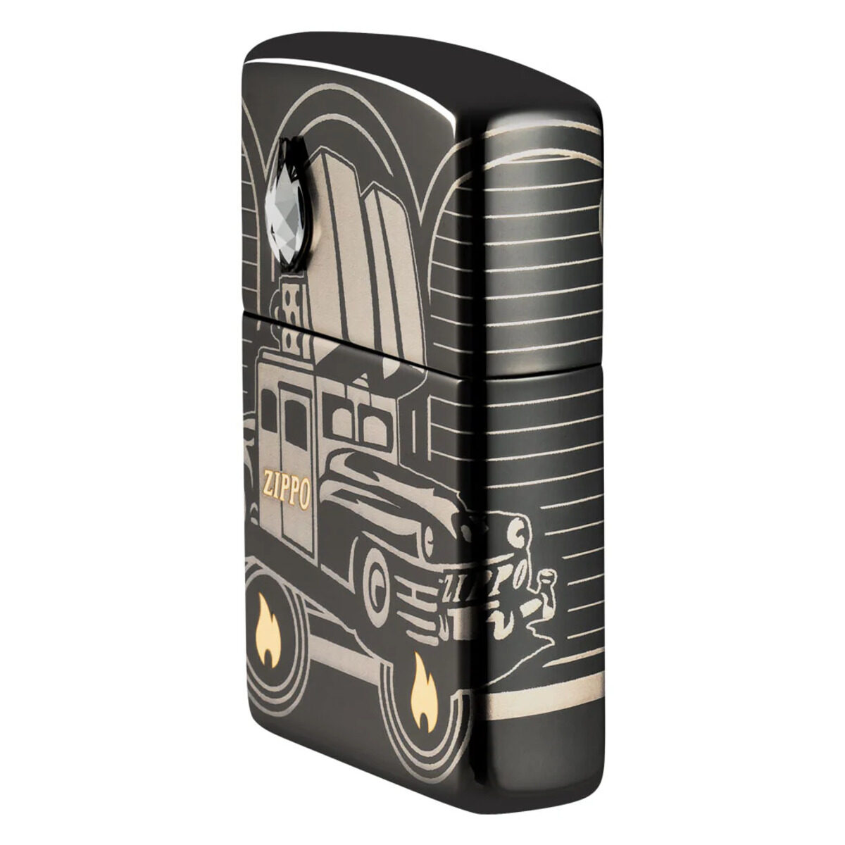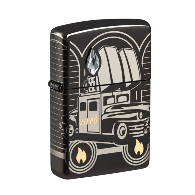 Αυτός ο αναπτήρας Armor High Polish Black Collectible απεικονίζει το εμβληματικό αυτοκίνητο της Zippo σε όλο του το μεγαλείο χρησιμοποιώντας τη διαδικασία Photo Image 360°, η οποία επεκτείνει τη σχεδίαση σε όλες τις πλευρές του κομματιού. Η τεχνική Laser Two-Tone χρησιμοποιείται για να αποκαλύψει τη φλόγα Zippo και το εικονίδιο της 75ης επετείου σε πολυτελείς ορειχάλκινους τόνους, ενώ η «καμινάδα» του αυτοκινήτου διακοσμείται από ένα εκθαμβωτικό κρύσταλλο, επιλεγμένο ειδικά για την περιοχή σας: