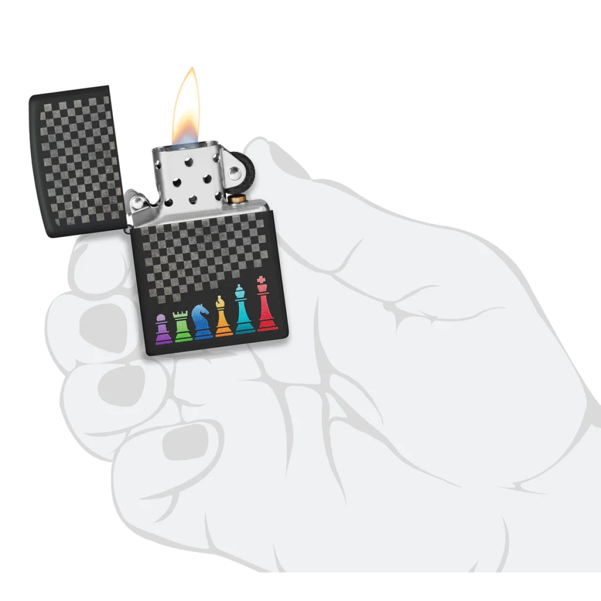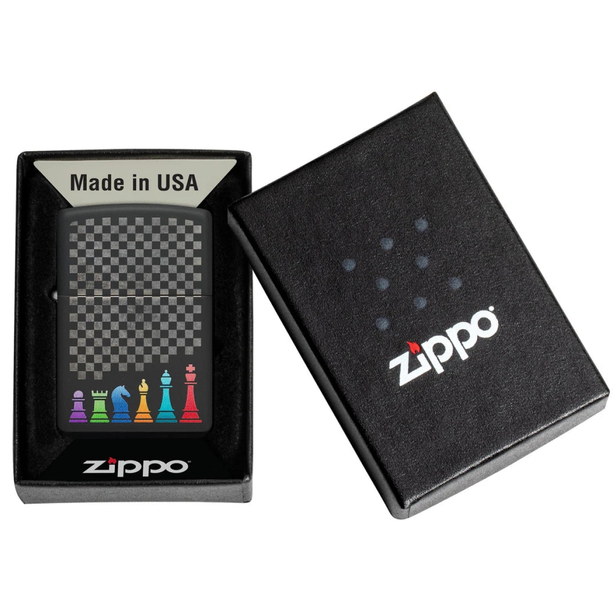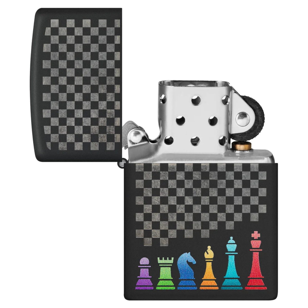 Είτε είστε πρωταθλητής σκακιστής είτε μόλις ξεκινάτε, δείξτε τη στρατηγική σας ικανότητα με αυτόν τον αναπτήρα Black Matte. Ο μαγευτικός αγωνιστικός χώρος και τα πολύχρωμα πιόνια αποτυπώνονται σε έναν νικηφόρο συνδυασμό των διαδικασιών Laser Engrave και Color Image. Διατίθεται συσκευασμένο σε συσκευασία δώρου. Για βέλτιστη απόδοση, γεμίστε με καύσιμο αναπτήρα Zippo.