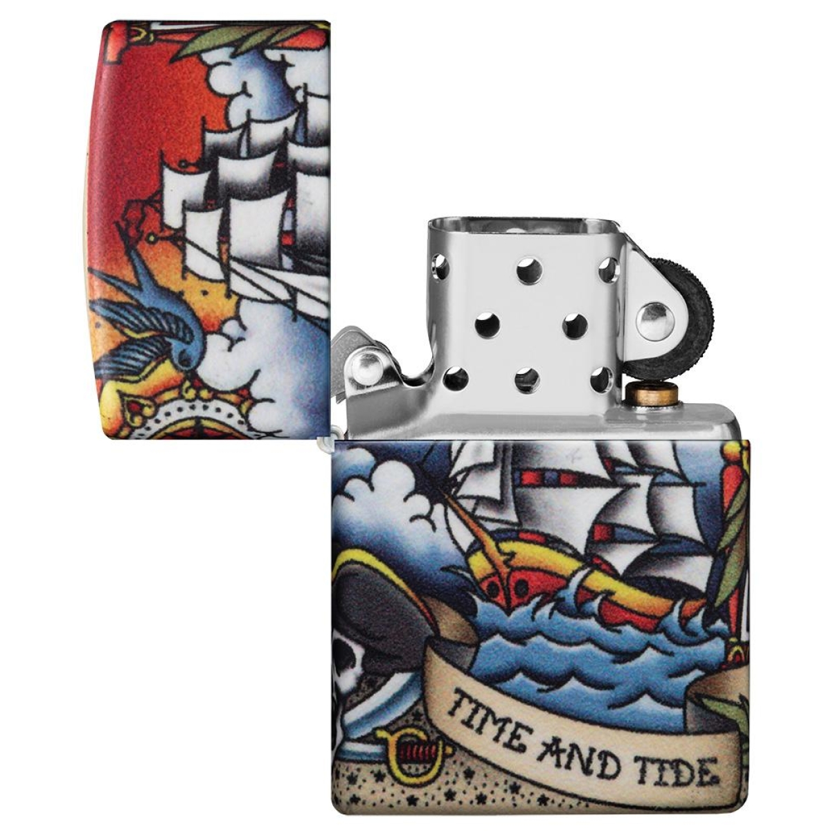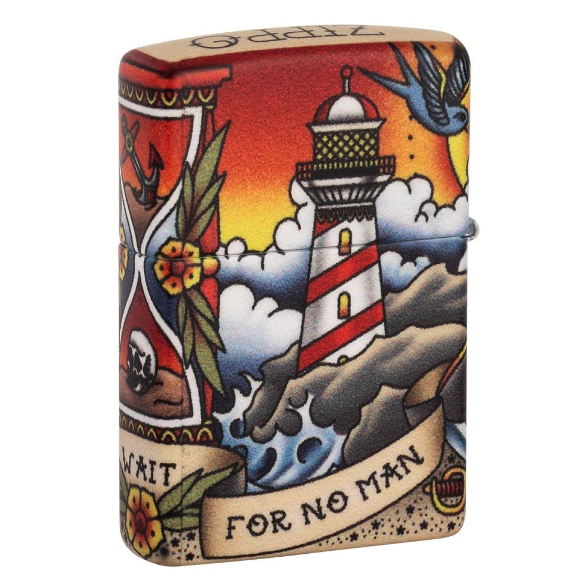 “Time and tide wait for no man” – Find this iconic quote in a script that wraps around this classic Nautical Tattoo Design lighter. Whether you’re a fan of the American traditional tattoo style or the open sea-inspired design, this design is bound to bring you back to a time of vintage tattoo parlors. This design uses Zippo’s 540 Color process, which allows for complete coverage of the lighter’s surface with precision artwork. Throughout this design are nautical-inspired elements such as the clipper ship sailing on the front and the lighthouse shining on the back. Comes packaged in a gift box. For optimal performance fill with Zippo lighter fuel.