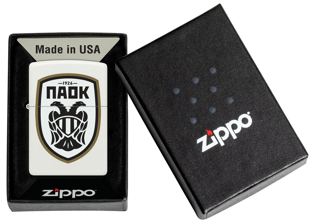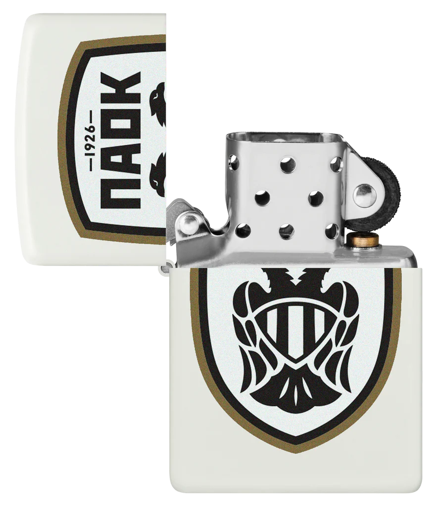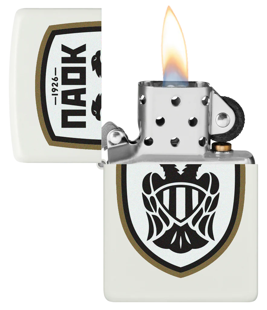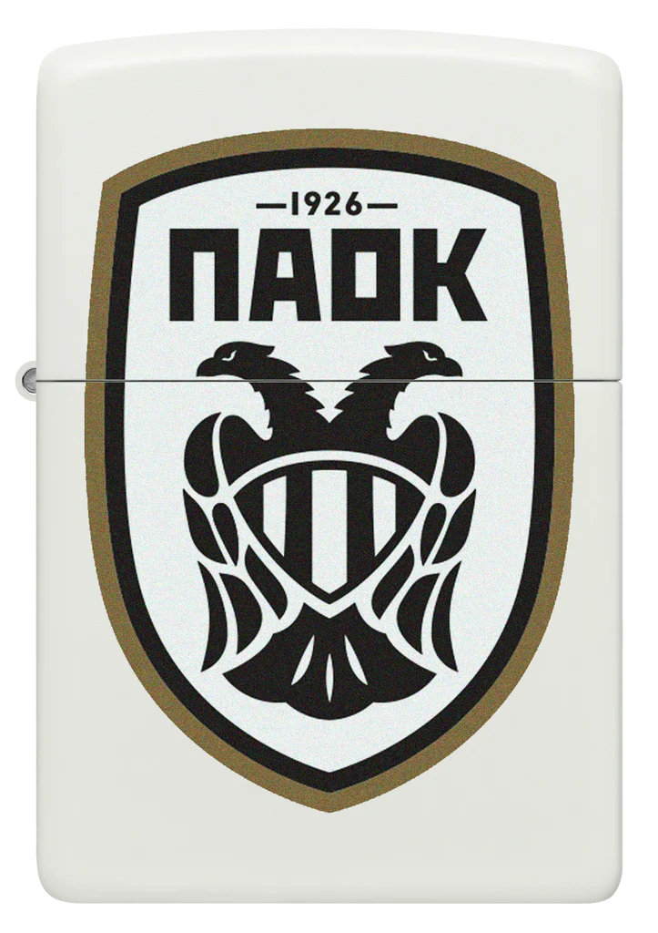 Ένας αναπτήρας σε ένα απαλό φινίρισμα White Matte, με την ασπίδα που περιέχει τον Δικέφαλο Αετό, τη λέξη “ΠΑΟΚ” και την ημερομηνία ίδρυσης της ομάδας